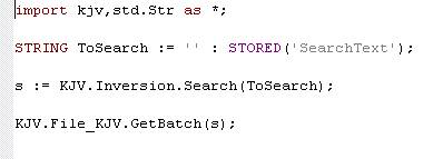 In the first two parts of this series we had gotten to the point where we could search the Bible for a set of words with a couple of simple lines of ECL. The challenge for part III was "what did we need to do to make a service to do the same thing that could be invoked by SOAP or from the Web?" Look at the following code: