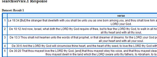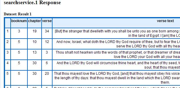 Note that the previous output (the .GetBatch) has now been made an attribute which is passed through a TABLE statement which handles all of the formatting. The word 'Verse' is the label of the text but will also appear as the column heading for the result. Therefore if you publish the Roxie service as before - the results will look like: