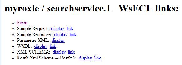 Of course this is still far from a professional website; the HTML response is really for quick development and internal use. If you want to go professional and fancy you will need to call your Roxie service (which is a SOAP service) using SOAP. Fortunately the Links tab of WS-ECL (which is just behind the form you were entering data into) contains a list of links to help develop and debug your newly created SOAP service.