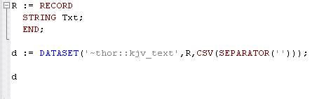 d := DATASET('kjv_text',R,CSV(SEPARATOR('')));