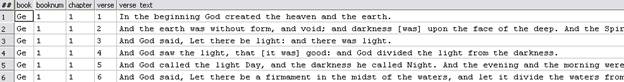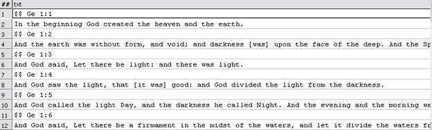 Those of you familiar with map-reduce probably think of a ROLLUP as a reduce; and with simple expressions it is. This is very different. The file came in order and within that order I have a reference of the form $$ Book Chapter:Verse followed by another record with the verse text. I can use that pattern in the sequence of the file to define when the rollup should occur[1]. The code above would gather any number of 'text' lines onto the preceding verse reference (although in this file only one line follows). The data now looks like this: