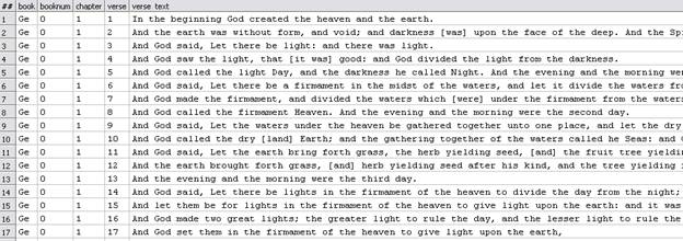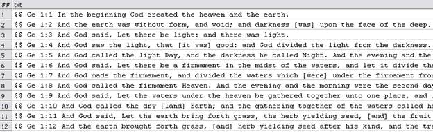 First task was to find a suitable Bible text to use. I selected the KJV as it is free from copyright outside of the UK and it is really available in many place. I actually selected a download with a slightly painful format; this is not just masochism - it allows us to look at some of the nastiness involved in using data that wasn't prepared for you. The link is: http://av1611.com/ and at least as of June 2011 the link to the raw text file (zipped) was in the bottom left corner.