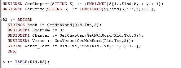 R2 := RECORD STRING5 Book := GetNthWord(Rld.Txt,2); UNSIGNED1 Booknum := 0; UNSIGNED1 Chapter := GetChapter(GetNthWord(Rld.Txt,3)); UNSIGNED1 Verse := GetVerse(GetNthWord(Rld.Txt,3)); STRING Verse_Text := Rld.Txt[Find(Rld.Txt,' ',3)+1..]; END;