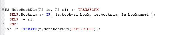 R2 NoteBookNum(R2 le, R2 ri) := TRANSFORM SELF.Booknum := IF( le.book=ri.book, le.booknum, le.booknum+1 ); SELF := ri; END;