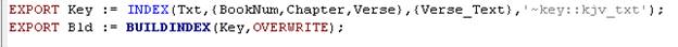 EXPORT Key := INDEX(Txt,{BookNum,Chapter,Verse},{Verse_Text},'~key::kjv_txt');