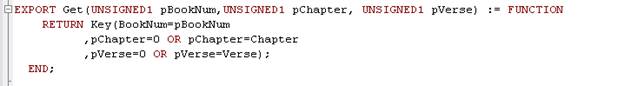 EXPORT Get(UNSIGNED1 pBookNum,UNSIGNED1 pChapter, UNSIGNED1 pVerse) := FUNCTION RETURN Key(BookNum=pBookNum,pChapter=0 OR pChapter=Chapter,pVerse=0 OR pVerse=Verse); END;
