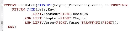 EXPORT GetBatch(DATASET(Layout_Reference) refs) := FUNCTION RETURN JOIN(refs,Key,LEFT.BookNum=RIGHT.BookNum AND LEFT.Chapter=RIGHT.Chapter AND LEFT.Verse=RIGHT.Verse,TRANSFORM(RIGHT)); END;
